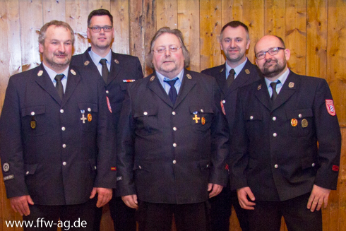 Im Anschluss konnte Klaus Herdegen für seine 40-jährige aktive Dienstzeit das Feuerwehrehrenzeichen in Gold, unterschrieben vom Bayerischen Innenminister Joachim Herrmann, in Empfang nehmen. Seit 30 Jahren ist Heike Kießling im Feuerwehrverein und wurde mit einer Urkunde geehrt. Für Ihre 10-jährige Kassierstätigkeit konnte Vorsitzender Schaller Simone Kießling ebenfalls ein kleine Präsent überreichen. Befördert wurden dann die beiden Anwärter Theresa Hick zur Feuerwehrfrau und Marco Köppel zum Feuerwehrmann. Jörg Hartwich und der neu gewählte Kommandant Michael Köppel wurden dann von Gerald Hick aufgrund der erfolgreich durchlaufenen Gruppenführerausbildung zu Löschmeistern ernannt.
