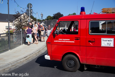 Wir scheiben das Jahr 1890 - im Sommer waren die Einwohner der Dörfer Albertsreuth, Götzmannsgrün und Bärlas heillos zerstritten. Dieser Streit eskalierte in Form der Auflösung der bis dahin bestehenden gemeinsamen Feuerwehr. Im Januar 1891 gründeten sich dann die Ortsfeuerwehren Albertsreuth-Götzmannsgrün und Bärlas sowie die Ge-meindefeuerwehr Seulbitz. Die Feindschaften zwischen den Dörfern hielten aber noch lange an und erst in den 1960iger Jahren herrschte einigermaßen Frieden in der gemeinsamen Gemeinde. Nachdem der Seulbitzer Kom-mandant anlässlich des Festabends im Seulbitzer Stein-bruch die Ge-schichte nochmals Revue passieren lies, drückte unser Kommandant Ger-ald Hick bei der Übergabe des Jubi-läumsgeschenks sei-nen Seulbitzer Amtskollegen und beendeten mit den Worten „Semma wieder gut“ den Konflikt unter großem Beifall der anwesenden Gäste. Anlässlich des 125-jährigen Jubiläums der Feuerwehr Seulbitz konnte diese vermelden, dass erstmals Damen in die aktive Feuerwehr aufgenommen wurden. Neben den Ehrenabend am 23. Juli folgte dann noch am Sonntag ein Festtag, an dem wieder der gesamte Fahrzeugpark der Feuerwehr ausgestellt wurde.