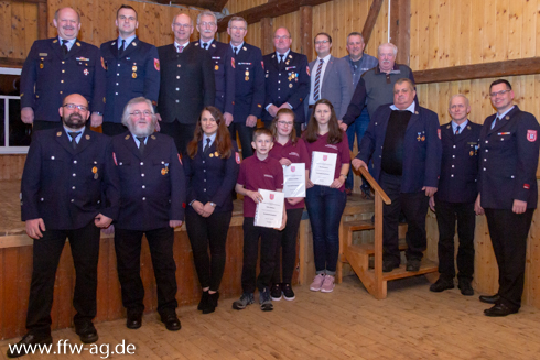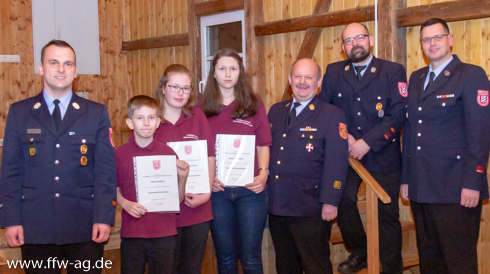 Nach den Verabschiedungen konnte Kommandant Köppel aber den Personalstand nicht nur ausgleichen, sondern durch die Neueintritte der Feuerwehranwärterinnen Elisa Rosemann und Johanna Schaller sowie der Feuerwehranwärter Hannes Grießhammer und Felix Strößner diesen auch etwas erhöhen. Alle vier Jugendlichen wurden per Handschlag in die Feuerwehr aufgenommen. Die neuen Feuerwehranwärter haben schon im vergangenen Jahr ihr Engagement für die Feuerwehr gezeigt, da sie bereits an zahlreichen Ausbildungsveranstaltungen innerhalb der Feuerwehr und auch zusammen mit der Schwarzenbacher Jugendfeuerwehr besucht haben. Sie nahmen bereits 2018 am Wissenstest für Jugendliche sowie an der Abnahme zur Jugendflamme in Schwarzenbach teil.